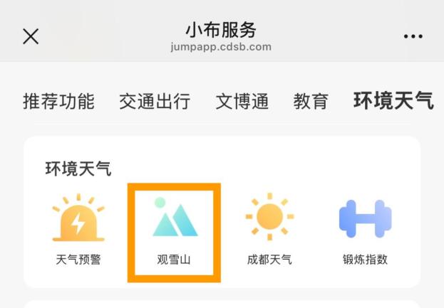 3、进入后,在“环境天气”中找到“观雪山”,点击查看“成都气象景观监测预报”,即可看到各观山点的实况。