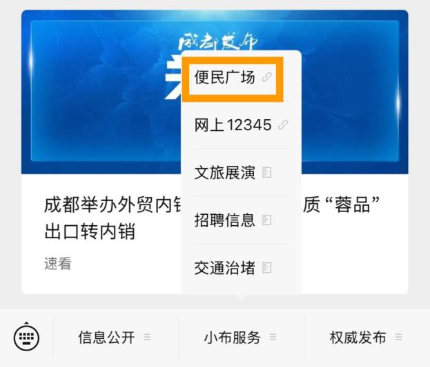 2、在“成都发布”微信公众号首页聊天对话框下方找到“小布服务”-“便民广场”;