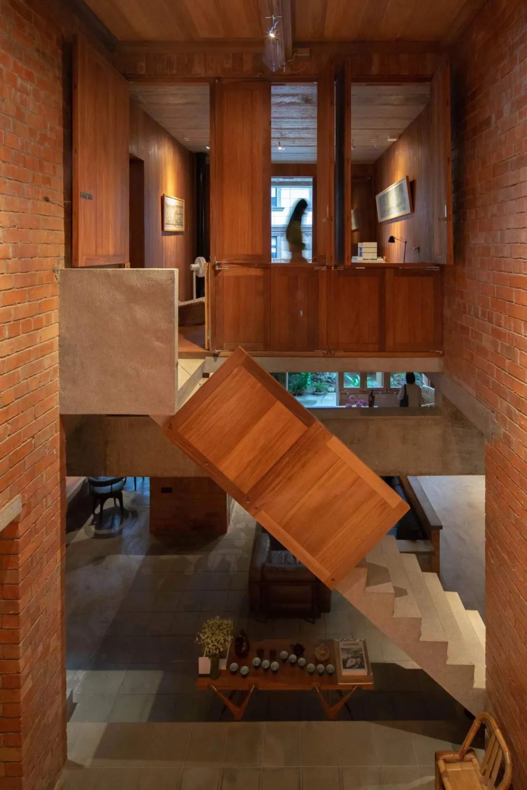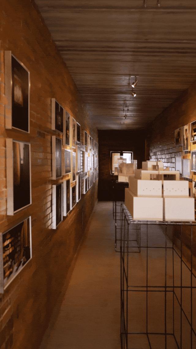 当我到达二楼时,我会经过一条走廊。在这里,我做了一个小展厅,挂了一些摄影图片,中间有一个建筑模型。然后我转过身,走到卧室的窗外。