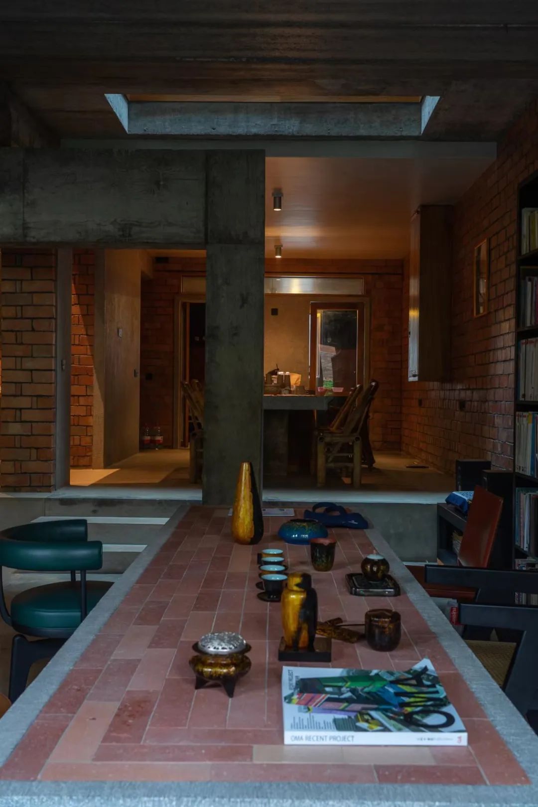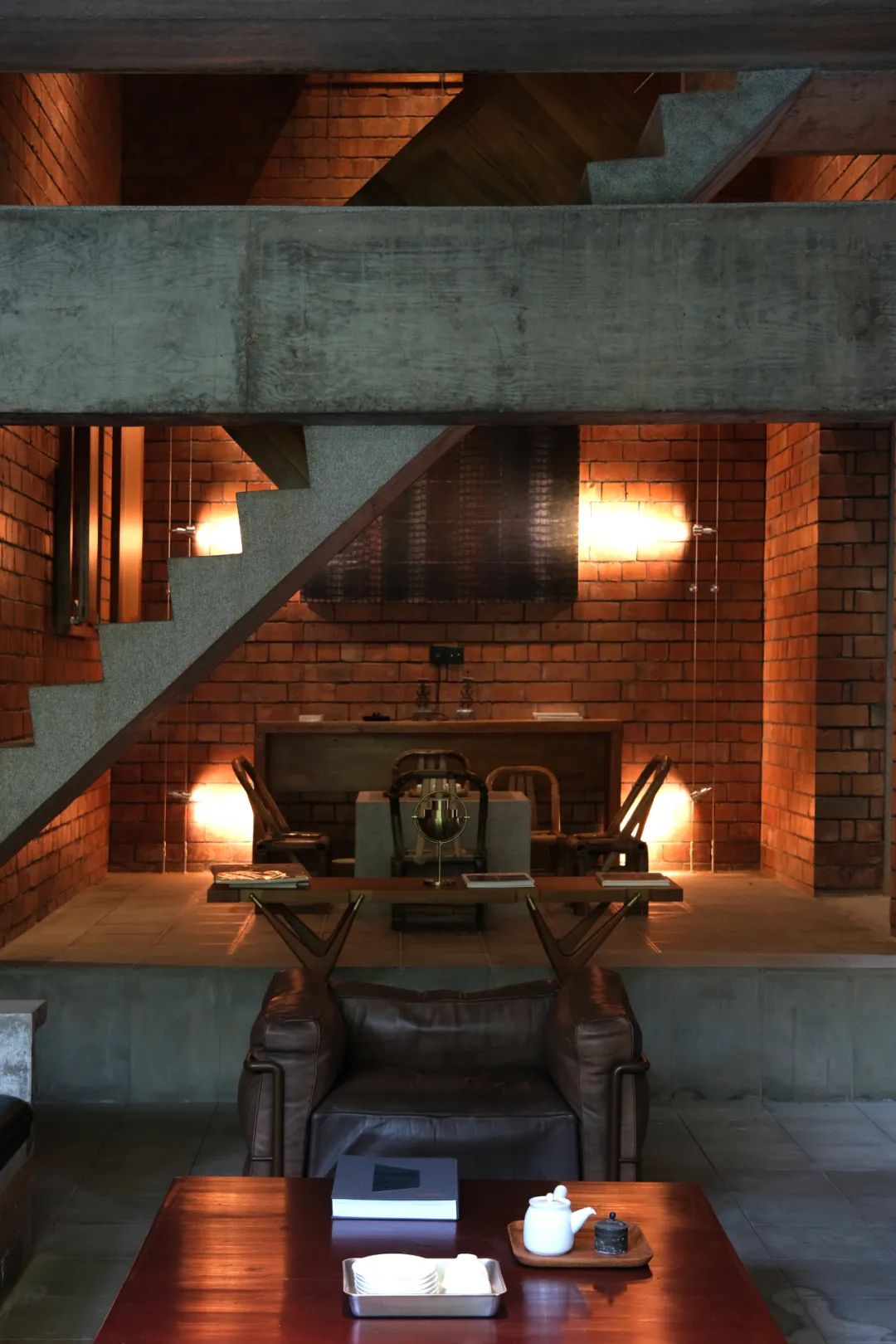 这个茶馆是中国传统的“中堂”空间,双层通高。本来应该放八仙桌的地方,但是我们做了一些改进:一个水泥桌,旁边放了几把竹椅,投射了我们小时候在户外吃饭时的小桌子。现在你还能在农村看到这种生活习惯。