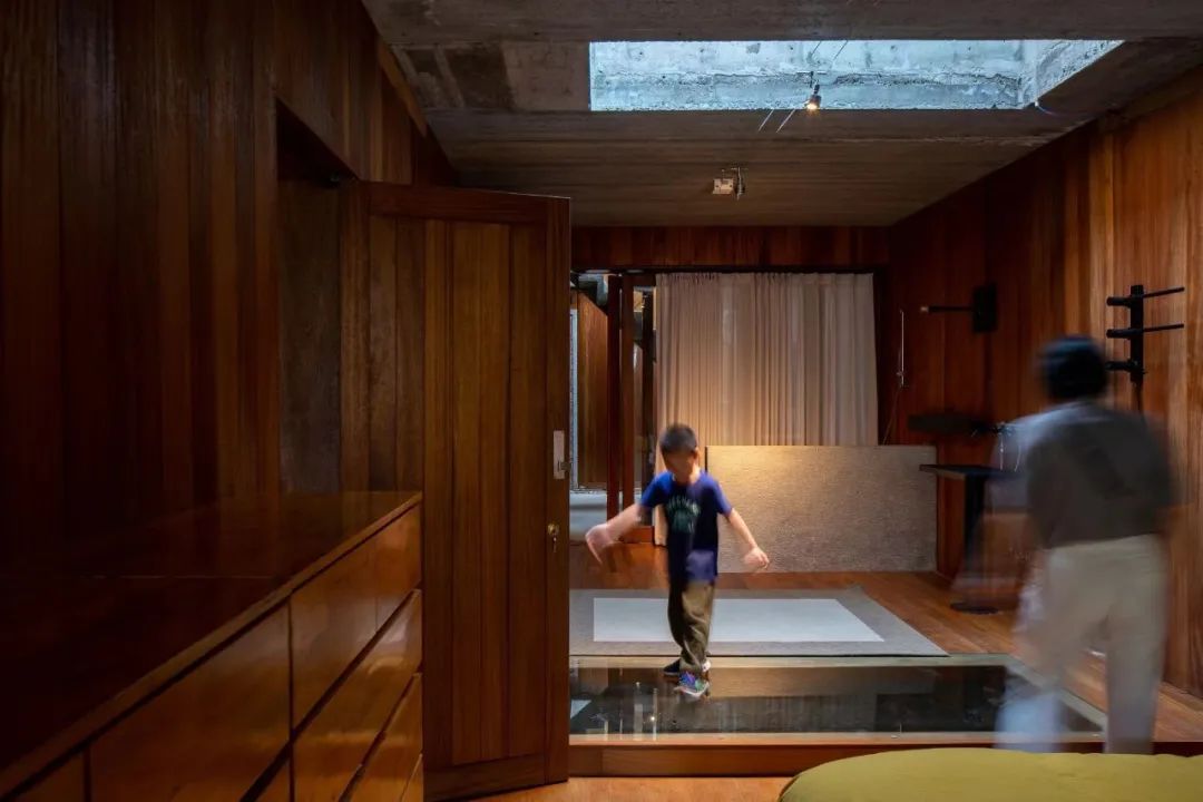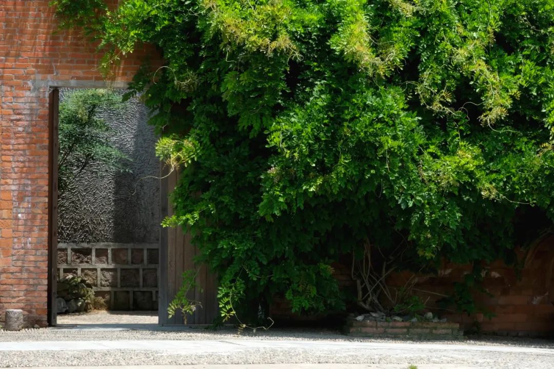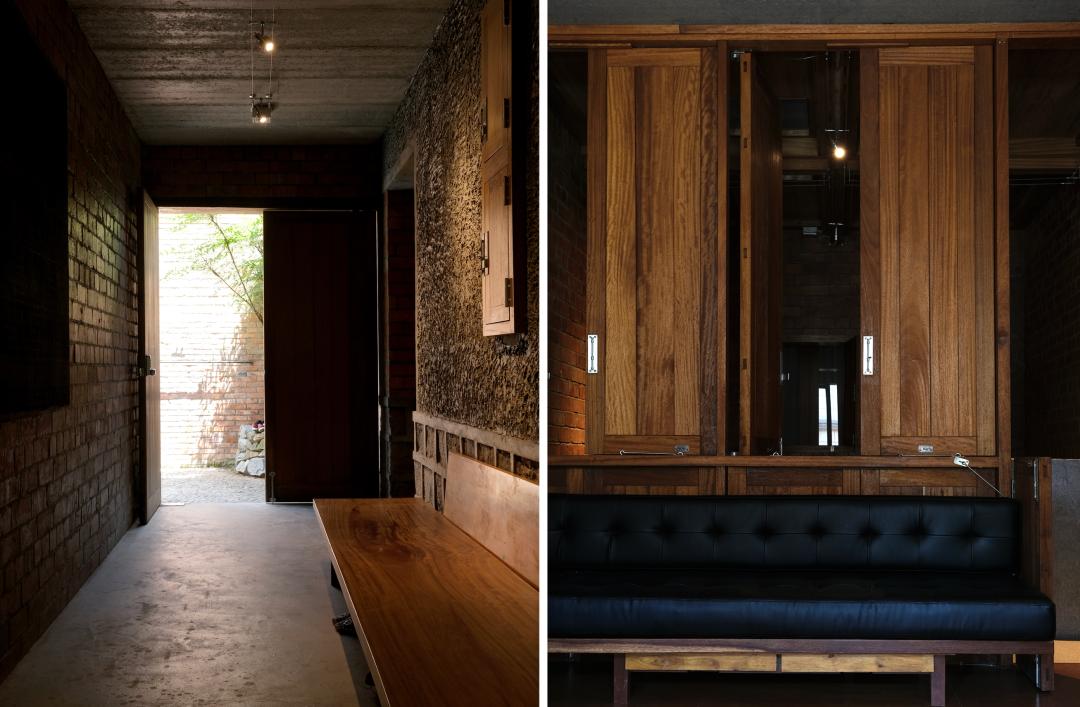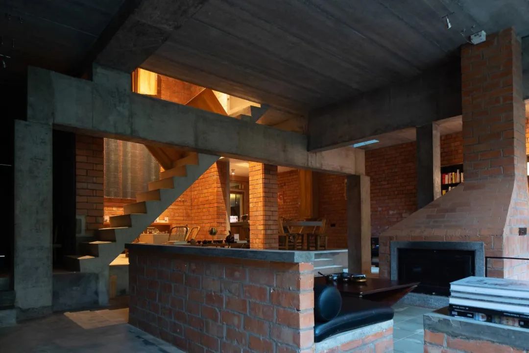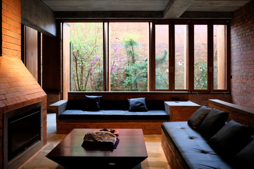 房子的西侧基本没有窗户,从远处看,它看起来像一个堡垒。但是当你进来的时候,首先,一根紫藤覆盖了门洞,你可以通过小巷到达客厅。中间有一个壁炉,周围有一些梁柱,也参考了明代的梁式建筑。