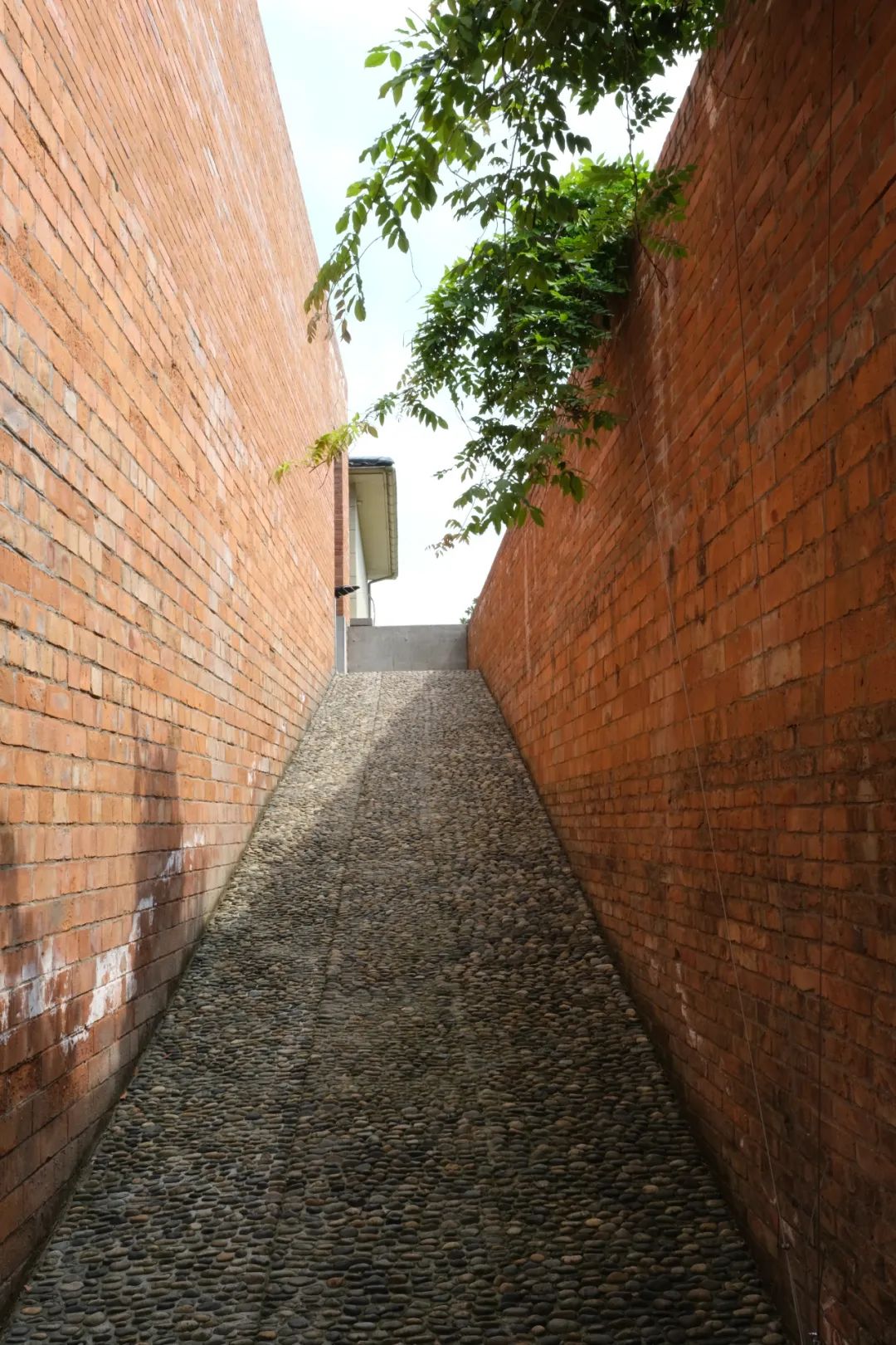从大门直接右转是一个很长的斜坡,直接连接到楼上,不用进入客厅。这条上坡路以河卵石为底,与屋外村道的材质完全相同。