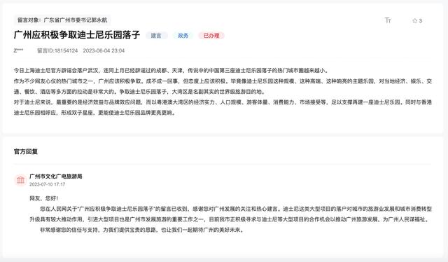 广州曾公开回复网友“接触迪士尼”