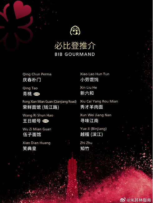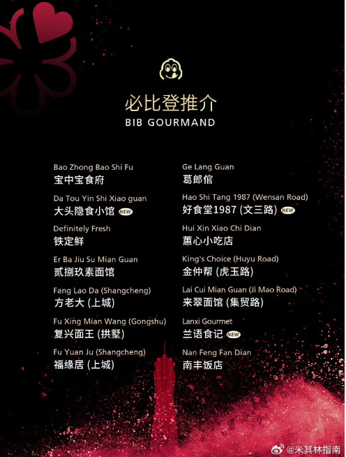 五家餐馆首次出现在必比登推荐名单中,它们是:大头隐食小馆,好食堂1987(文三路)、王日顺号,兰语食记,青桃和点心店。