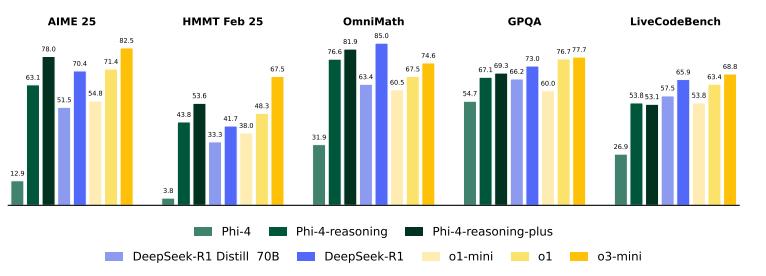 图注:Phi-4在跨领域基准测试中推理模型的表现。