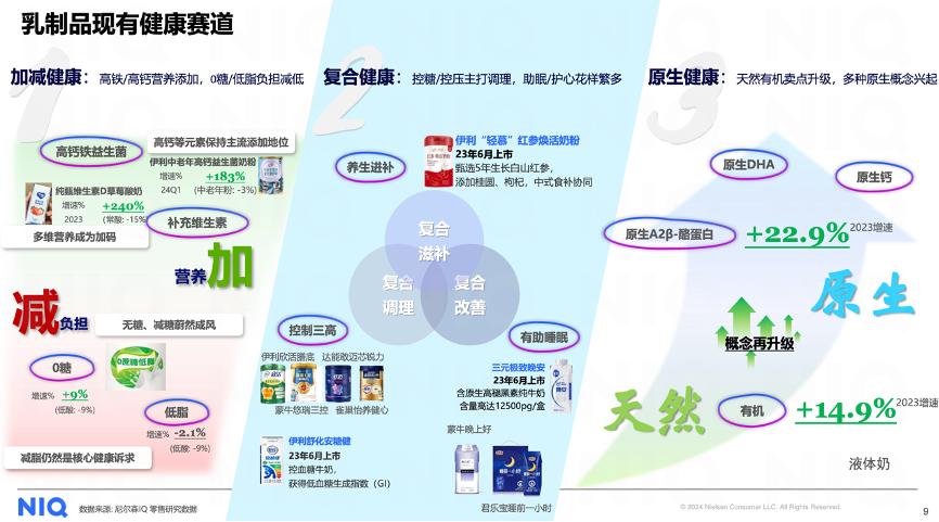 (图为尼尔森报告,乳品升级三个方向加减健康,复合健康,原生健康)