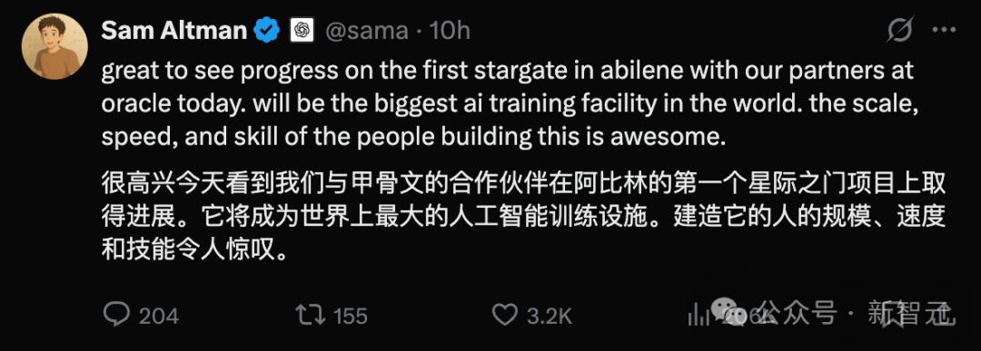 就在刚才,奥特曼还特意在X上发布了一篇关于Abilene调查的帖子,以表达对方的看法。「星际之门」及「OpenAI for Countries」支持项目。
