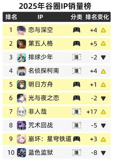 甚至在《2025闲鱼谷趋势报告》中,《第五人格》周边销量仅次于《爱与深空》,成为年轻人最喜欢的游戏IP之一。