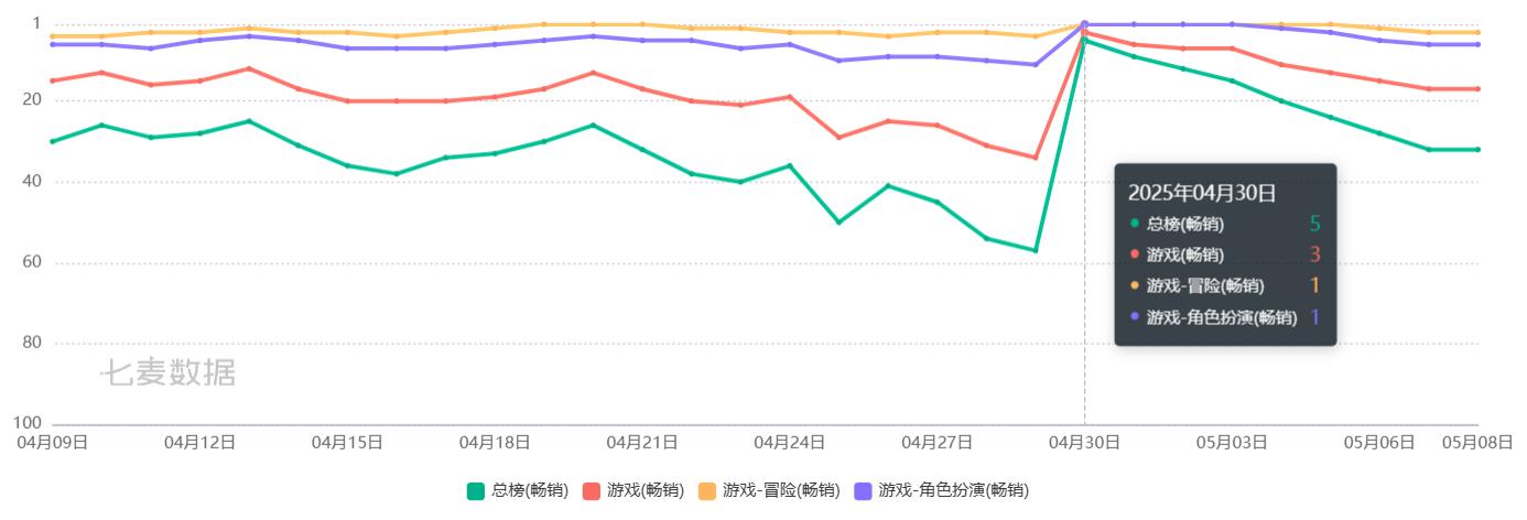 根据七麦的数据,《第五人格》是近一年游戏畅销榜的前50名常客,甚至在7周年达到前3名,低于国王和吃鸡。