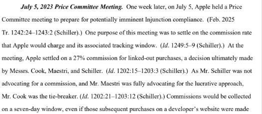 他还证明,直到2024年1月16日(美国最高法院驳回苹果申请上诉的日期),苹果才知道购买链接之外的费用。但苹果的商业文件显示,事实恰恰相反,苹果合规计划的主要部分,包括27%的佣金,是在2023年6月至7月多次讨论之后,在2023年7月确定的。很明显,这是一个“误导”法庭认为其“不分析外部支付成本”的谎言。