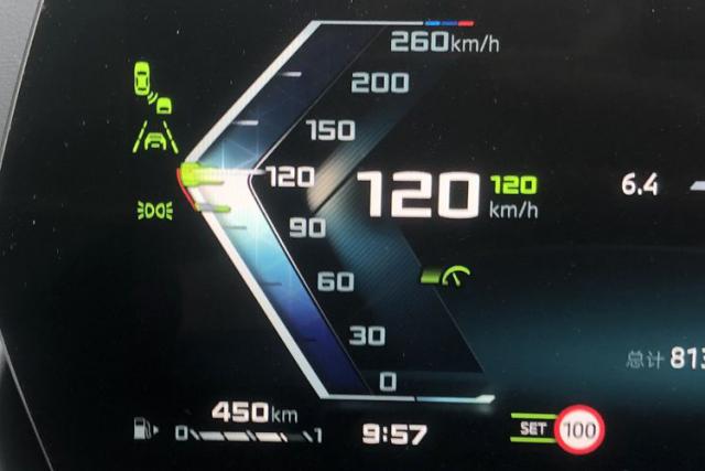 仪表盘右侧的柱形图,显示功率,你看,在速度上, 120 在公里时,功率只使用了 12% 或 离它的巅峰有13%的地方 221 KW,还有很长的路要走。我注意了一下,弯道里的大脚给油,一般也只升到了 50% 上下。