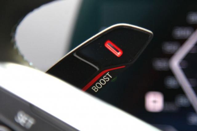 换挡拨片在左手,同时也是 BOOST 启动按钮,这是宝马特有的加力方式,可以在短时间内-大约- 10 秒上下-额外提高功率,享受刺激。那种感觉,就像是把火箭插在屁股上,打火推。