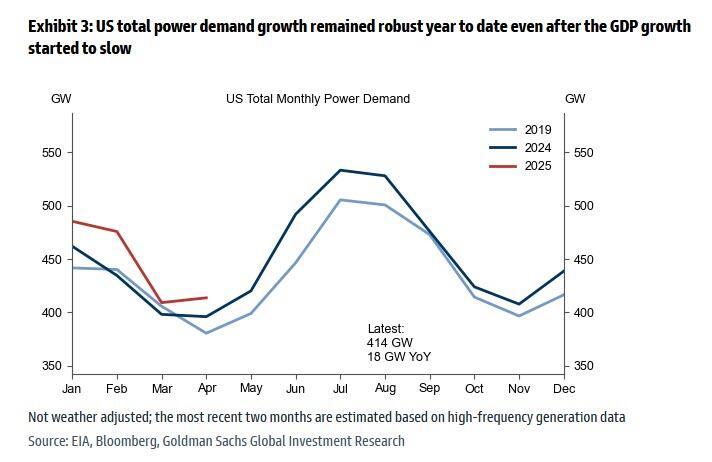 根据高盛发布的一份报告,截至今年,美国电力需求同比增长5.5%,远高于过去十年0.6%的平均年增长率。根据Zerohedge的分析,这可能表明美国目前的GDP增长率可能已经达到3%甚至更多。
