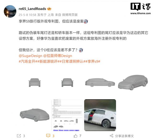 而且今天早些时候,博主 @re65_LandRoads 发布了一组享界 S9 专利图“废案”,外观图中的尾灯采用了不同于实车的设计:虽然也是贯穿式尾灯,但延伸到两侧下方,形成凹陷,强调“立体感”。