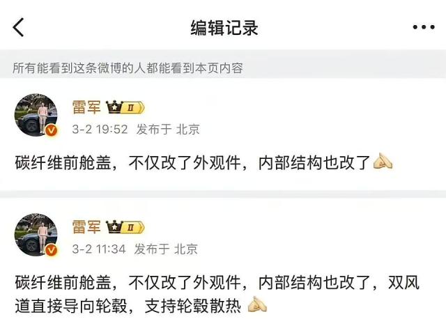 而且碳纤维双风道前盖,是前不久博主发布的一段视频表示质疑,他们用风扇向前看。 SU7 Ultra 下唇进气口吹风,却发现前盖打孔没有风量导出,引起外界质疑,贴上了“情感部件”的标签。原因可能是雷军曾经发消息说,为了碳纤维前盖,连内部结构都变了。现在这个表现明显不符合这个说法,所以被大家质疑。