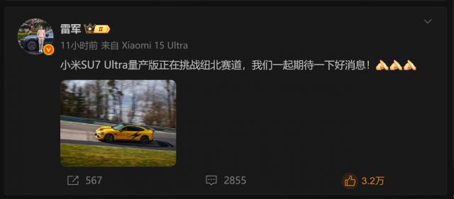 另外,雷军还在微博上发了一条消息,小米 SU7 Ultra 大批量生产正在挑战纽北跑道,让大家一起期待好消息。