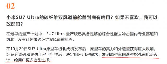 据小米汽车官方回复,在最早的量产计划中,SU7 Ultra 国内专业跑道和纽北的综合性能已经足够了,所以没有制定碳纤维双风道前盖的计划。