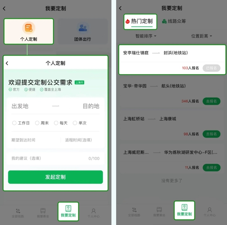 用户可以点击“个人裁缝”或“团队出行”在定制公交平台的“我想定制”页面。提交需求后,系统会智能聚合市民需求,规划定制公交线路。