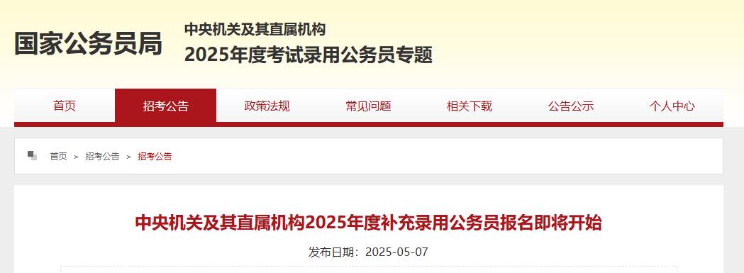 2025年,中央机关及其直属机构开始补充录用公务员报名,报考人员可于5月8日8日开始。:00至5月10日18:00期间登录“2025年中央机关及其直属机构公务员考试专题网站”(http://bm.scs.gov.cn网上报名/kl2025),面试将于5月中下旬进行。