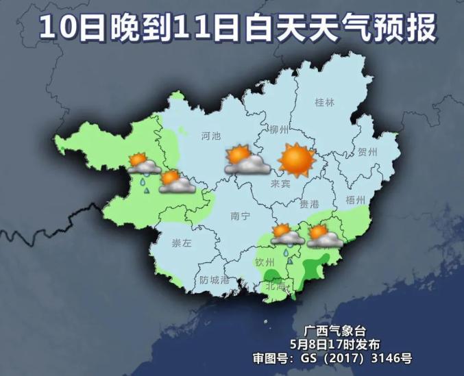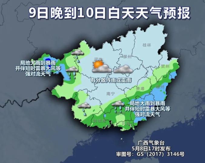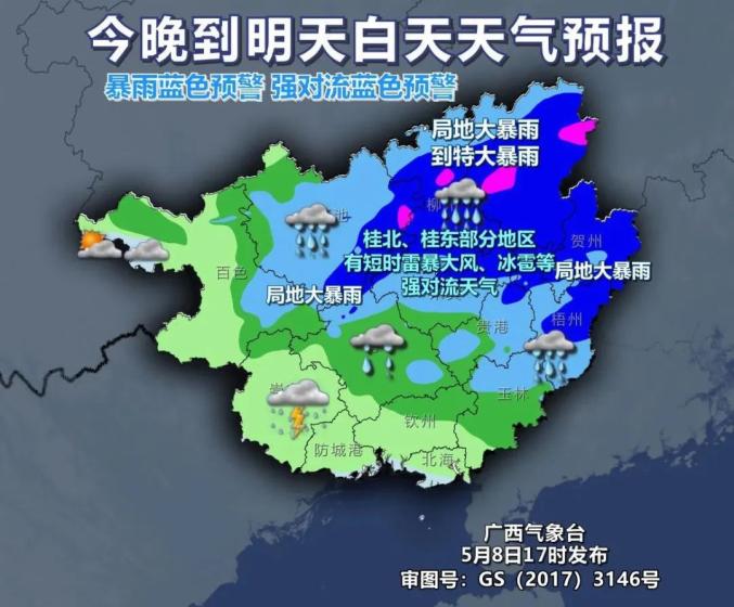 五月八日十时,广西气象台发布蓝色暴雨预警,十一时,广西壮族自治区气象局启动重大气象灾害(暴雨)Ⅳ等级应急响应。