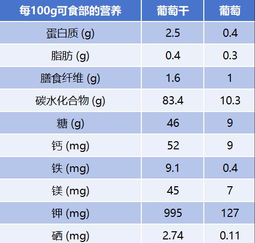 ↑上述数据来自《中国食品成分表》,不同品种、不同产地的红提或蓝莓干,营养成分略有不同。