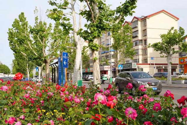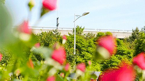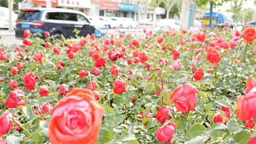 更为奇妙的是裕龙二街两旁的月季坛,红色的月季在微风中摇曳,从楼上俯瞰就像一条绚丽的“花漾丝带”。