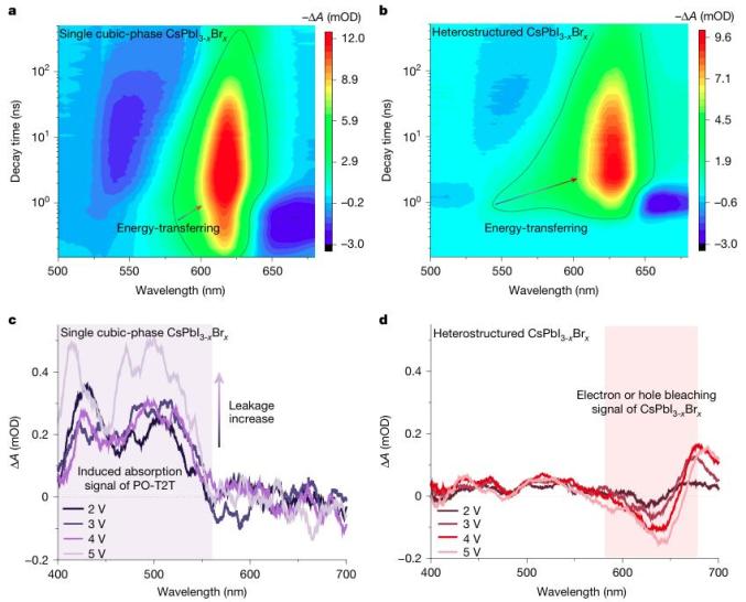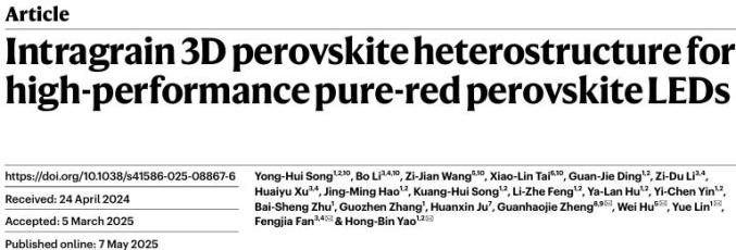 金属卤化物钙钛矿是有前途的下一代发光二极管。(LED)选择发光材料。LED矿采用纯红色钙钛矿。(PeLED)同时实现高亮度和高效率是目前的目标之一。CsPbI3-xBrx三维(3D)发射体具有优异的载流子传输能力和高色纯度,可使纯红PeLEDs快速、超高亮度。但是,这些设备在高电流强度下容易出现效率下降和亮度下降的情况。宋永慧(博士),中国科技大学、李波(博士后)、王子健(博士生)和台晓琳(博士生)是共同的第一作者。中国科技大学姚宏斌教授、樊逢佳教授、林岳教授、胡伟教授是共同的交流作者,团队自主创造了激发暂态光谱的电力。(EETA)该技术,并且利用该技术揭示了空穴泄漏是造成纯红色三维钙钛矿LED效率滚降的重要因素,并且开发出新型三维钙钛矿异质结亮层减少空穴泄漏(图1),成功制备出高性能纯红钙钛矿LED。以“相关研究成果”Intragrain 3D perovskite heterostructure for high-performance pure-red perovskite LEDs“在国际顶级期刊Nature上发表了标题。