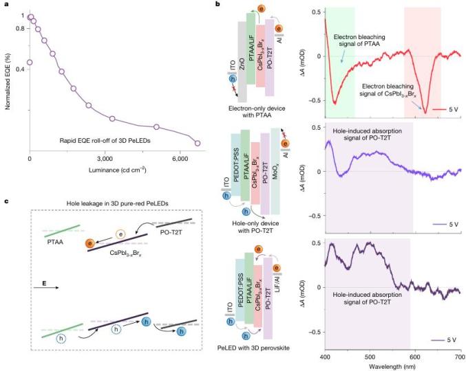 图3、晶体内三维异质结构对钙钛矿发光二极管进行抑制(PeLEDs)空穴泄漏的影响。© 2025 Nature