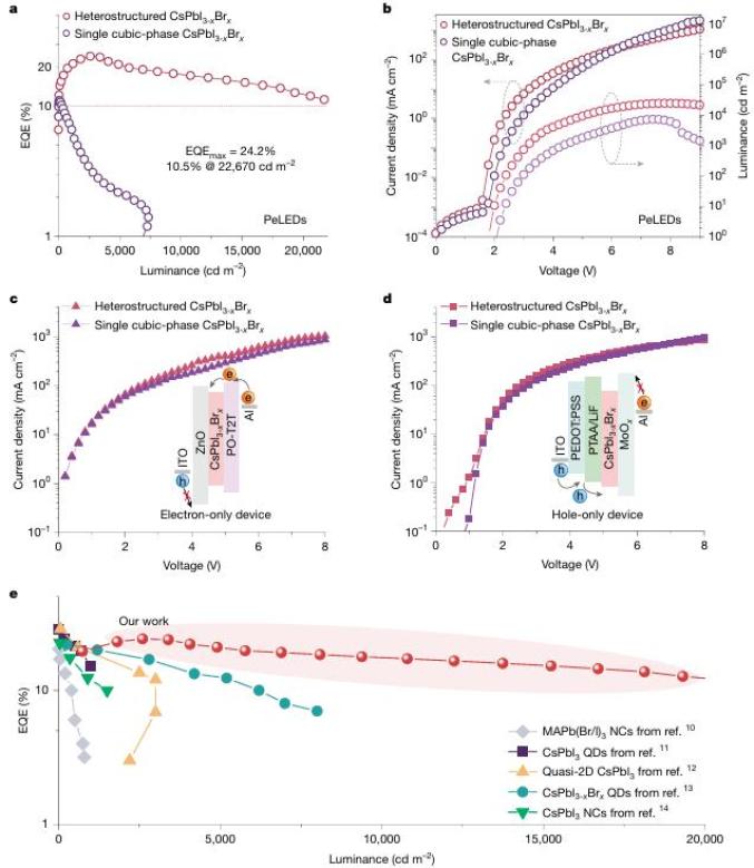 图4、CsPbI3-xBrx基纯红LED三维异质结的性能。© 2025 Nature