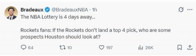 休媒 Bradeaux 提示火箭球迷,选秀大会抽签仪式还剩下。 4 天空即将举行,如果火箭队不能抽到前四名,那么我们应该关注哪些新秀?