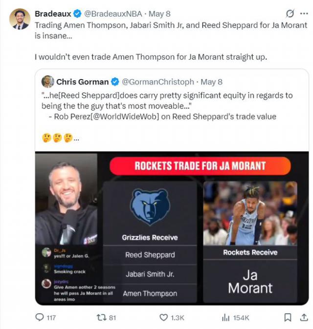 美记建议火箭队用阿门、谢泼德、小贾巴里三人换莫兰特,休媒。 Bradeaux 感觉到这个交易建议简直是疯了,我们甚至不愿意用阿门单换莫兰特,因为阿门是未来的超级巨人。