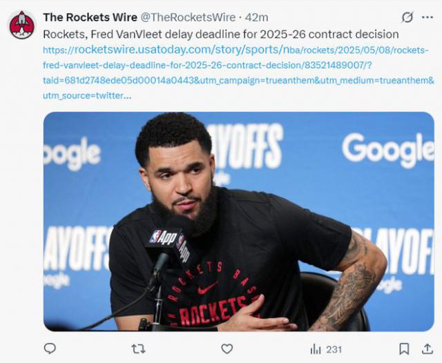 北京时间 5 月 9 日本,休斯顿火箭已经和弗雷德 - 范弗利特同意让他走 25-26 赛季 4400 一万名球员的选项被推迟了 6 月 29 一天,这样就可以等到季后赛结束后再做决定,这是为火箭选秀抽签后的交易运作做准备。