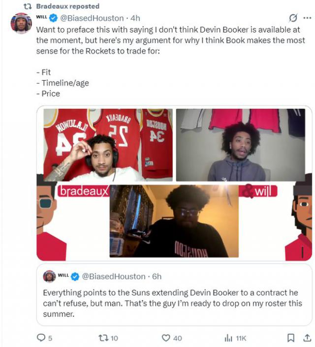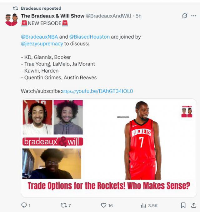 休斯顿三大博主早些时候:Bradeaux、Biased、Jeezysupremacy 现场直播中畅谈球队休赛期的潜在引援话题,在这里谈到:凯文 - 杜兰特,扬尼斯 - 阿德托昆博,德文 - 布克,特雷杨,贾 - 莫兰特,拉梅洛 - 鲍尔、科怀 - 伦纳德,詹姆斯 - 哈登、昆廷 - 格兰姆斯,奥斯汀 - 里夫斯等 10 人。