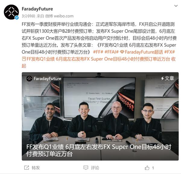 【CNMO 科技消息】5 月 9 日本,法拉第的未来(以下简称 FF)公布了 2025 2008年第一季度业绩显示,其经营实施和财务状况持续改善,FX 在品牌和产品方面取得了重大进展。第一季度业绩显示,FF 收益 30 万美金,为 FF 91 交付和租赁收入;经营净亏损 4380 与去年同期持平的万美元;经营现金流出 2030 一万美元,同比增长 38%;融资现金流入 2460 一万美元,第三季度融资现金流入超过经营现金流出。