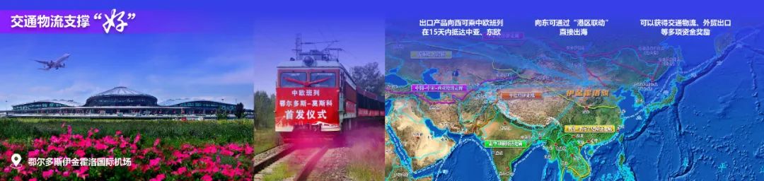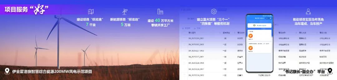 二是转型支持“好”,能为用户提供脱颖而出的机会。伊旗汇集了资源、能源、地理位置、渠道等诸多因素,既能为企业的快速发展提供有力支撑,又能给企业带来明显的比较优势。“好”的零碳生态支撑。高标准建设了中国第一个零碳产业园,发布了中国第一个零碳标准,建设了以绿色电力为主体的新型电力系统。企业可以通过电力多边交易、增量配电网绿色电源直供、自发自用等多种形式获得持续稳定的绿色电源供应。综合用电价格可降至每度0.29元左右,仅为沿海地区的50%。企业入驻后,可以率先享受集零碳供能、零碳检验、零碳认证、零碳贸易于一体的全球零碳服务,迅速成为绿色制造和绿色智能产品生产的领导者。支持“好”应用领域。内蒙古防沙治沙与风电光伏一体化工程、鄂尔多斯光伏长城等项目将在“十五五”期间直接提供大量新能源设备订单。区域车辆能源路云一体化应用、重型卡车清洗更换、建筑光伏一体化、鄂尔多斯市300多个煤矿、600多家以能源化工为主导的工业企业绿色智能升级,也将为用户提供巨大的市场空间。公司入驻后,可就近与目标客户对接,开拓销售市场。运输支持“好”。伊旗内融京津冀,周联晋陕宁,外通“中俄”过道,拥有国际机场、综合保税区、中国生产服务物流枢纽、中欧列车、航空港等多个开放平台。企业入驻后,出口货物可乘中欧列车前往西部,15天内到达中亚、东欧,通过“港区联动”直接出海前往东部,还可获得交通、出口贸易等多项资金奖励。