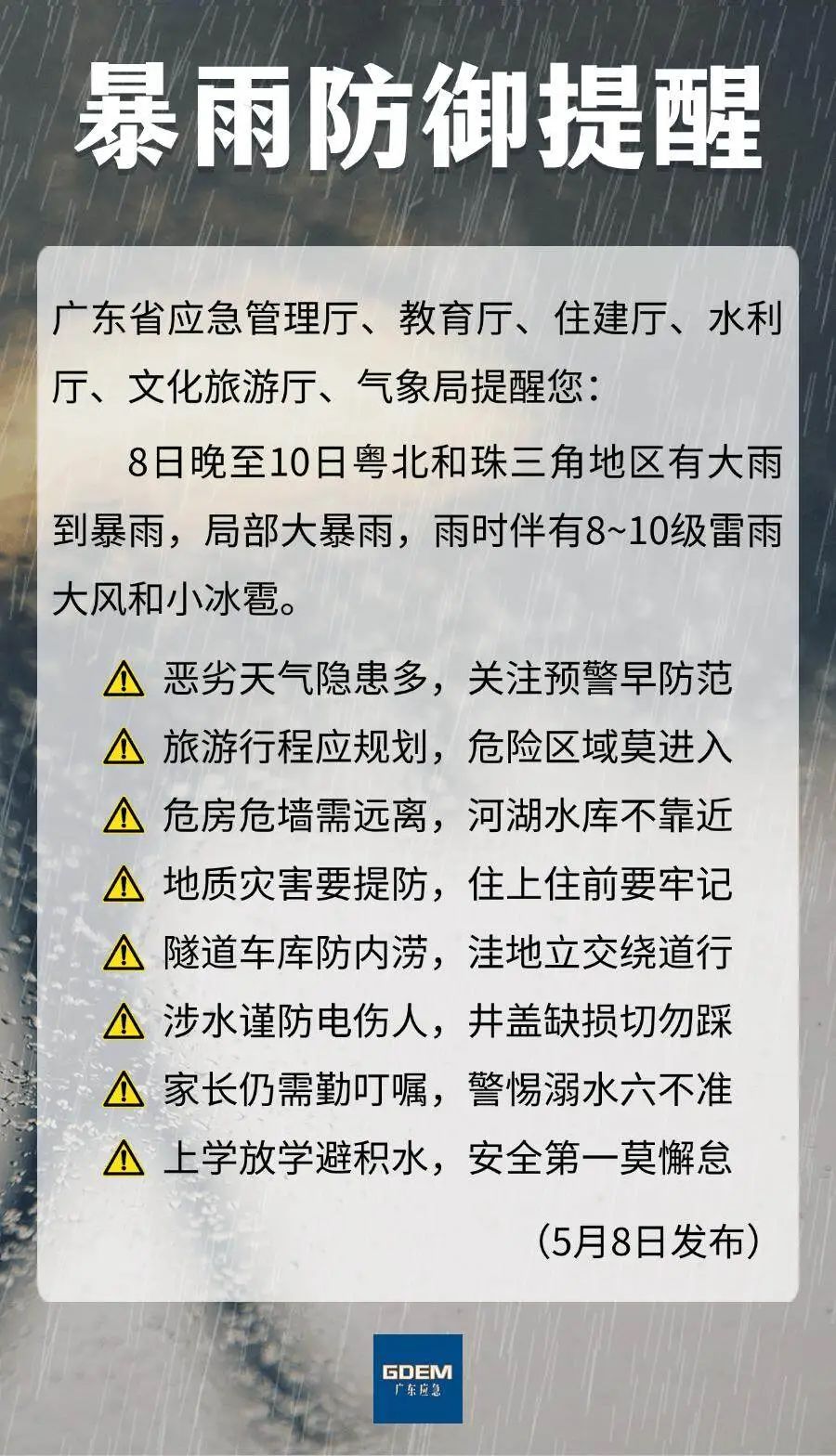 针对强对流天气,5月8日,广东省六部门联合发布暴雨预警。广东省应急管理厅、教育厅、住房和城乡建设厅、水利厅、文化旅游厅、气象局提醒:8日晚至10日,粤北、珠三角地区大雨至暴雨,部分暴雨伴有8~10级雷雨和小冰雹。