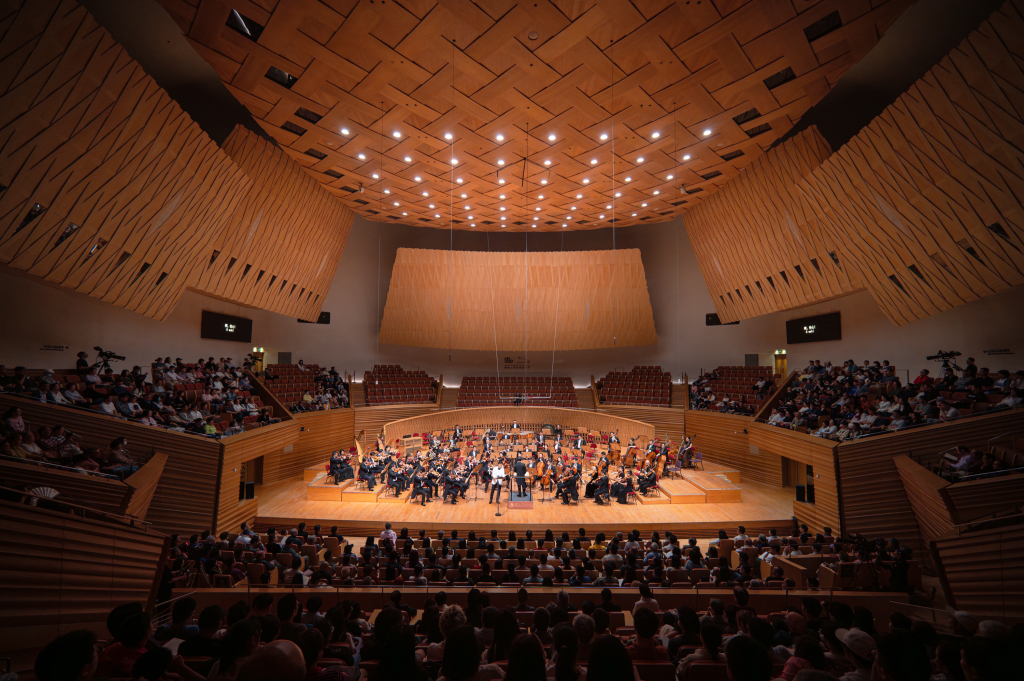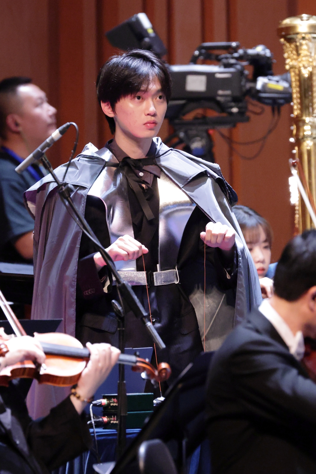 在第二套曲目中,景焕指挥“国交”在前半段表演了施万春的《节日序曲》和赵季平的《第一小提琴协奏曲》,陈曦看着乐谱独奏。下半场的交响曲《山河颂》由乐团创作室六位年轻作曲家的五位接力创作,每人一章。每个人的音乐风格都很有代入感和史诗感,既有抒情的段落,又有壮丽的山河,咸宜老少皆宜。