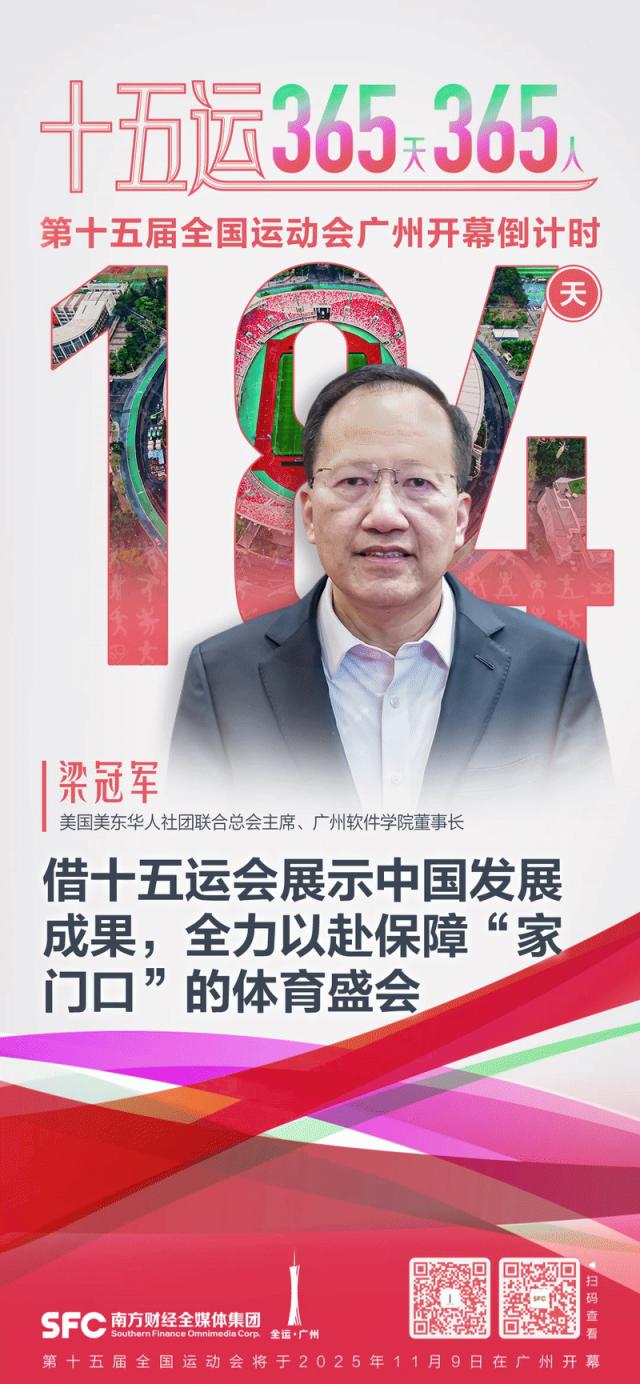 第十五届全国运动会将在 2025 年 11 月份在粤港澳三地举行。它是一项体育赛事,也是促进全民健身、促进体育事业高质量发展的重要机遇。在十五运会开幕倒计时一周年之际,南方财经全媒体集团与十五运会、残特奥会广州赛区执委会推出“十五运会” 365 天 365 “人”栏目聚焦选手、企业家、专家学者、体育爱好者、公众的全运故事和全运期待,让更多人了解和支持十五运,生动展现中国的体育精神、城市活力和文化魅力。
