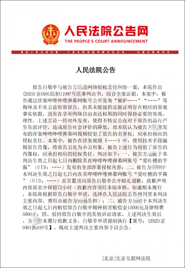 法院判决被告人在本判决生效之日起7日内删除其在哔哩哔哩弹幕网账号发布的所有侵权内容,并在首页向原告白敬亭公开道歉。道歉声明的内容应至少保留。 72 此时,被告方某在本判决起效之日起7日内赔偿原告白敬亭精神损害赔偿金。 15000 元及律师费 5000 元。上述判决生效后,方某未履行道歉责任,白敬亭申请强制执行,北京互联网法院公布了上述判决内容。