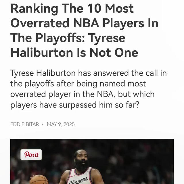 然而,为了公平起见,美媒《Fadeaway World》比塔尔的作者,也是晒出一份。 2024-25 在赛季季后赛中,最被高估的是 10 著名球员,让我们看看谁的排名被高估或低估了。