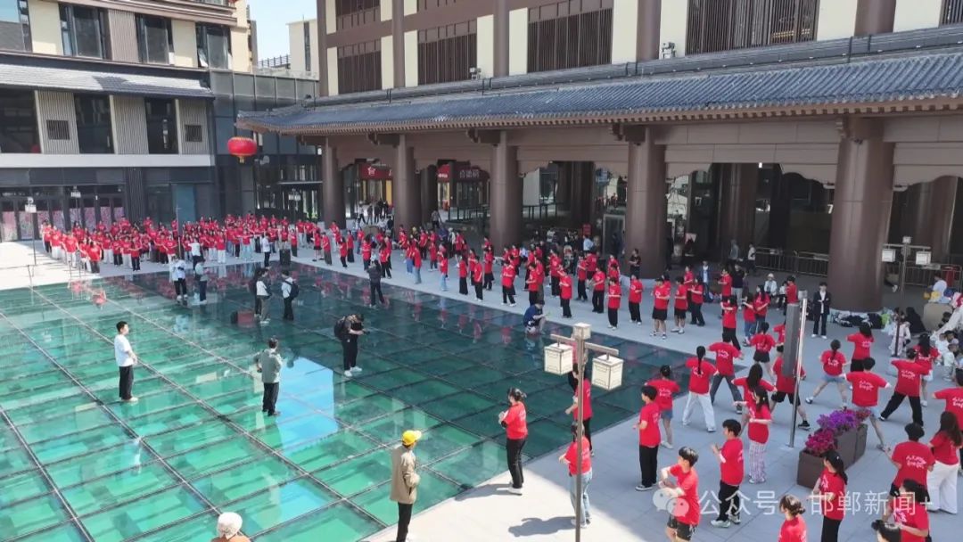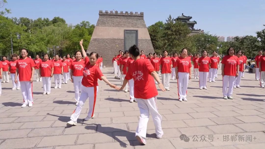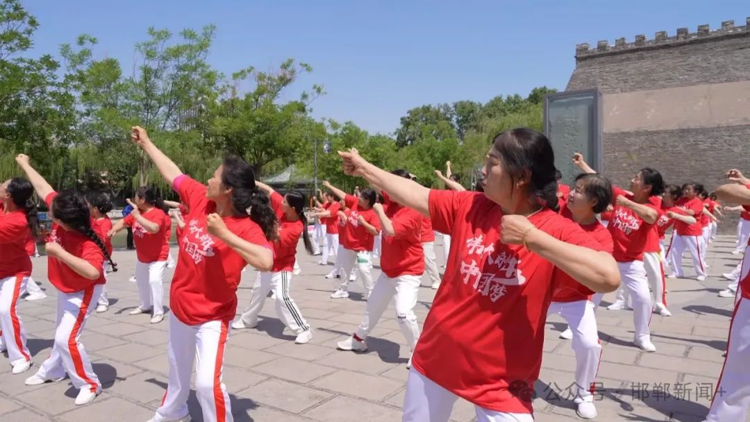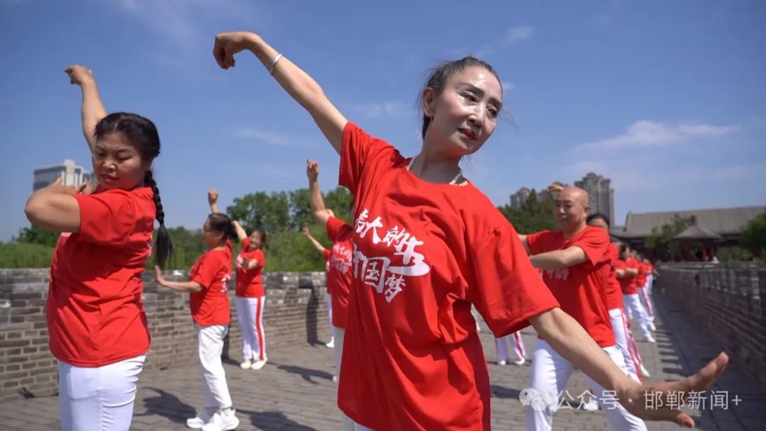身穿红色文化t恤的邯郸道历史文化街区群体踩着明亮的音乐节拍翩翩起舞。