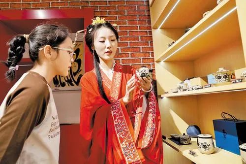 ▲五月一日,邯郸成语之都·文创旗舰店,身穿东汉袍的工作人员(右)向顾客介绍磁州窑茶具。