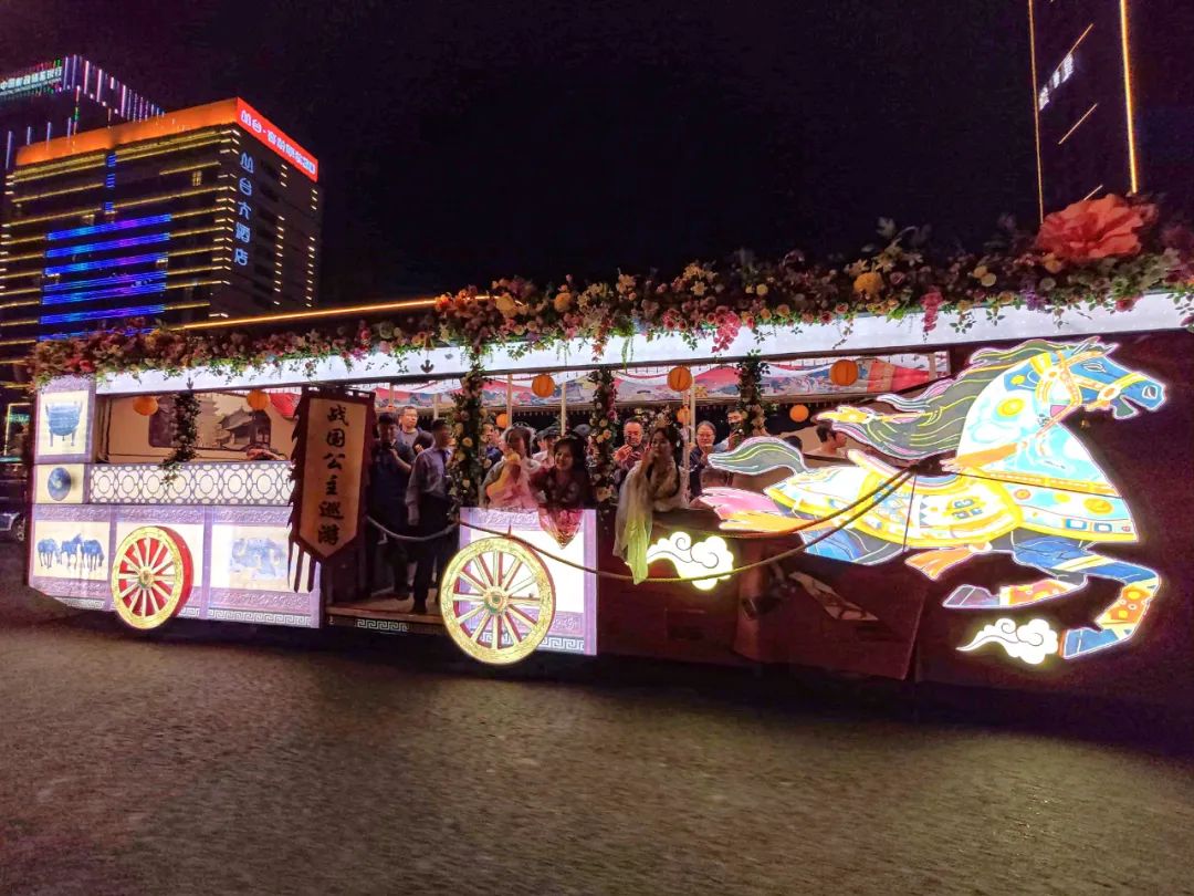 在邯郸道西门,车身上布满了五颜六色的鲜花,车身上的战马穿着锦绣的彩衣,昂首阔步,展现出威武。车尾的“东汉公主”画像像一朵花,仿佛是从漫长的历史中走出来的。