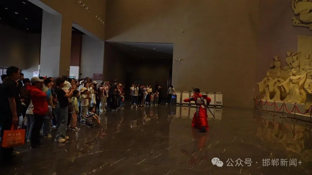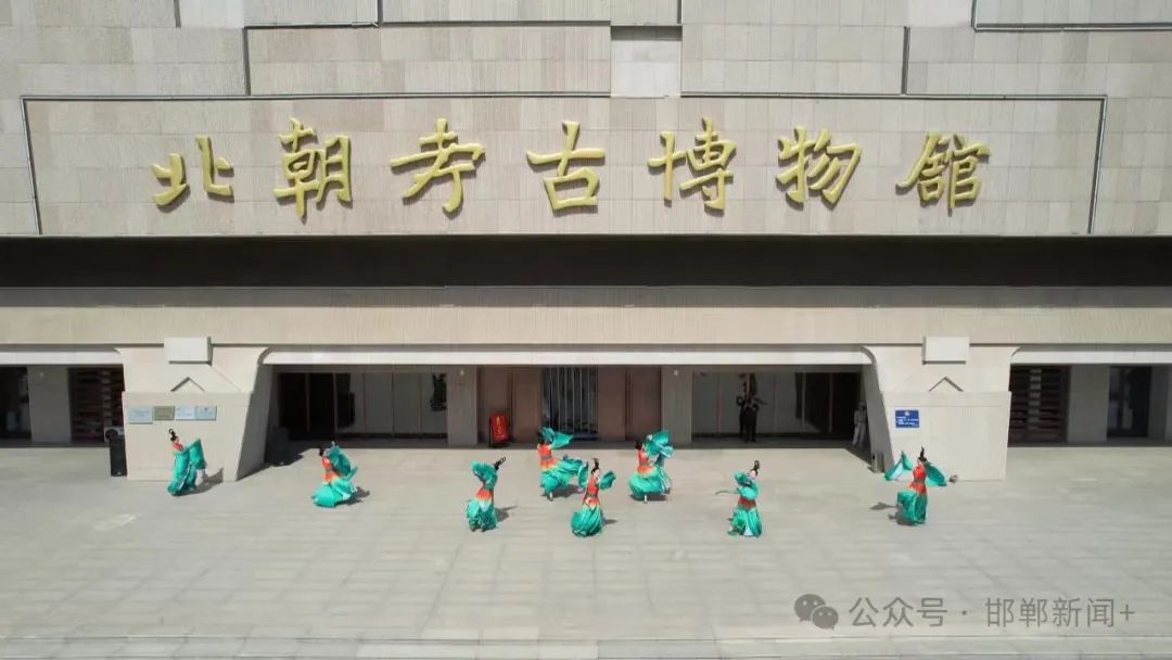 在磁县北朝考古博物馆入口处,身着北朝服饰的音乐舞蹈迎宾表演震撼登场。一首歌《勒勒歌》翻译了北朝文化的豪迈,引起了观众不时的热烈掌声。