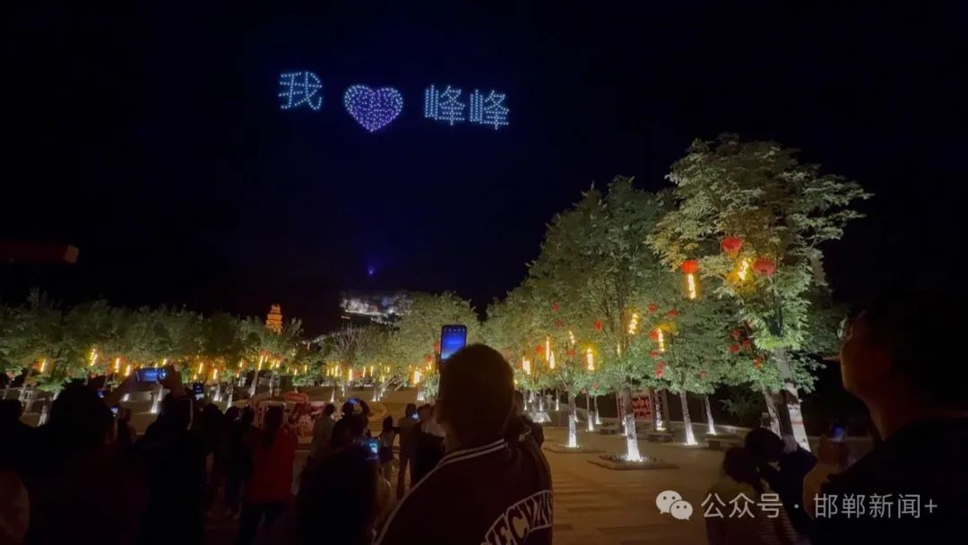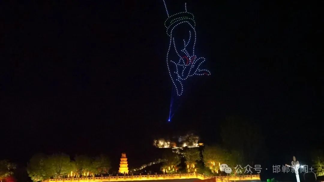 灯亮时,“光影北朝”无人机秀震撼上演在响堂山石窟上空。400架无人机在夜空中改变了许多独特的文化符号,如在响堂山石窟壁画中用乐器跳舞的飞行形象和“得花”手势。华丽的光影与古老的石窟相得益彰,吸引了许多游客在现场拍照。