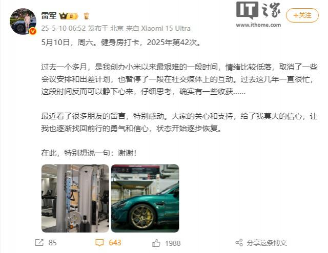 IT 世家 5 月 10 日消息,小米集团创始人、董事长兼 CEO 雷军刚刚在他的个人微博上发布消息,这是他自小米以来的消息。 SU7 事故发生后第一次公开表态(通常会有运营人员打理账号),也是他们停止互动一个多月后的明牌回归。