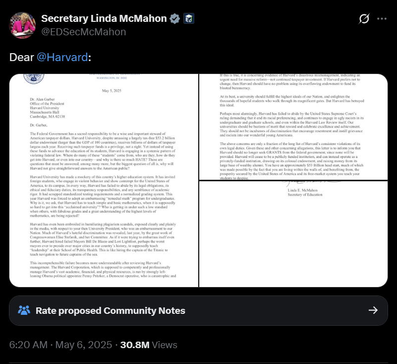 最近,美国政府与哈佛大学发生了冲突。继哈佛大学在马萨诸塞州联邦法院正式起诉美国政府后,当地时间5月5日,美国教育部长琳达·麦克马洪宣布停止向哈佛大学所有联邦新拨款,并在社交平台上向哈佛大学校长艾伦·加伯公开了信件。