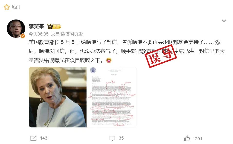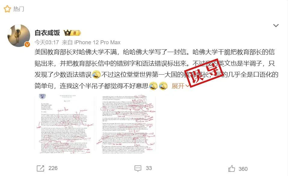 明查|哈佛大学批评美国教育部长的来信,红笔标注拼写错误?