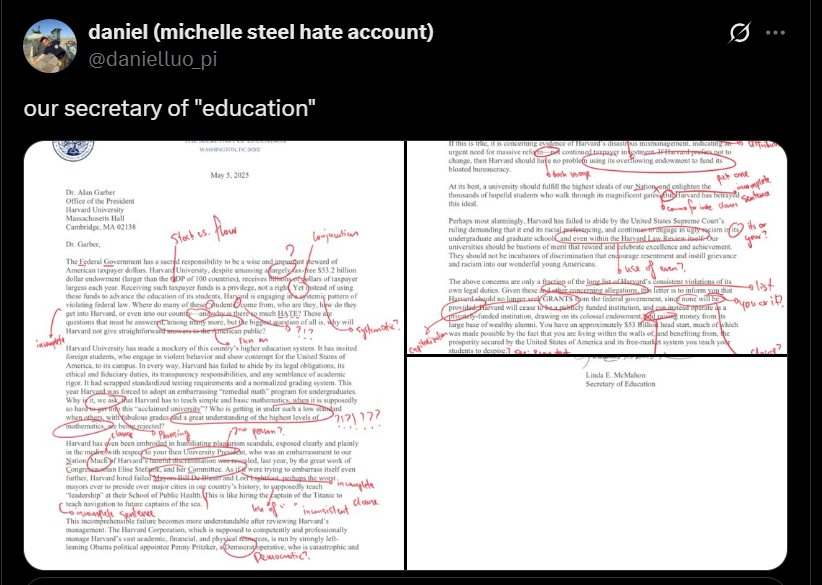 - “哈佛大学反击美国教育部长麦克马洪,在信中标注错误拼写和语法”的说法并不准确。图片来自x平台客户。@danielluo_pi,这个人和哈佛大学没有直接关系。