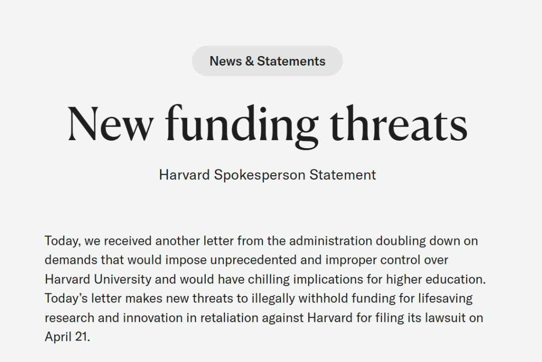 - 哈佛大学已经确认自己收到了政府的来信,称相关信函发出了“新威胁”,这是一种报复行为。哈佛将继续抵制美国政府的“非法越权行为”。